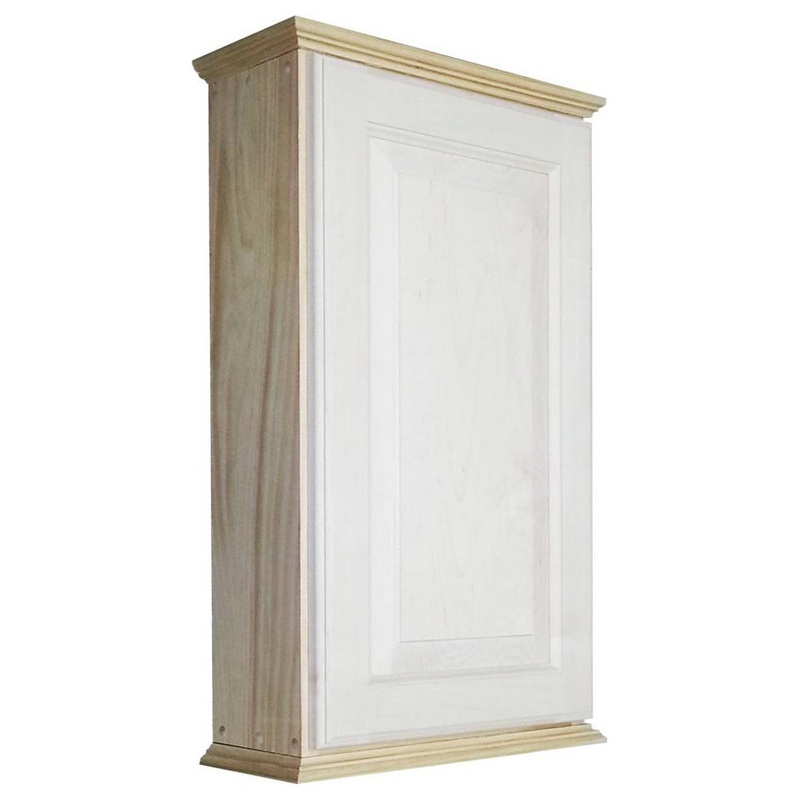 Mounts on the wall with steel mounting brackets inside for an easy installation. With two mounting methods, there is no need to worry about where the studs are in the wall. Three fully adjustable glass shelves slide into our patented shelf supports so they don’t tip or rock. Raised panel door sits on concealed hinges with soft close feature, door is reversible so you can mount it to open either direction. Perfect as a medicine cabinet, spice cabinet, or storage cabinet anywhere. OVERALL Measurements are 25.5h x 15.5w x 5.25″d OVERALL. You’ll have nearly 4.5″ of depth INSIDE the cabinet. Unfinished bare wood can be painted or stained as desired. Solid pine cabinet box with solid maple door. Proudly made in Sarasota, FL.