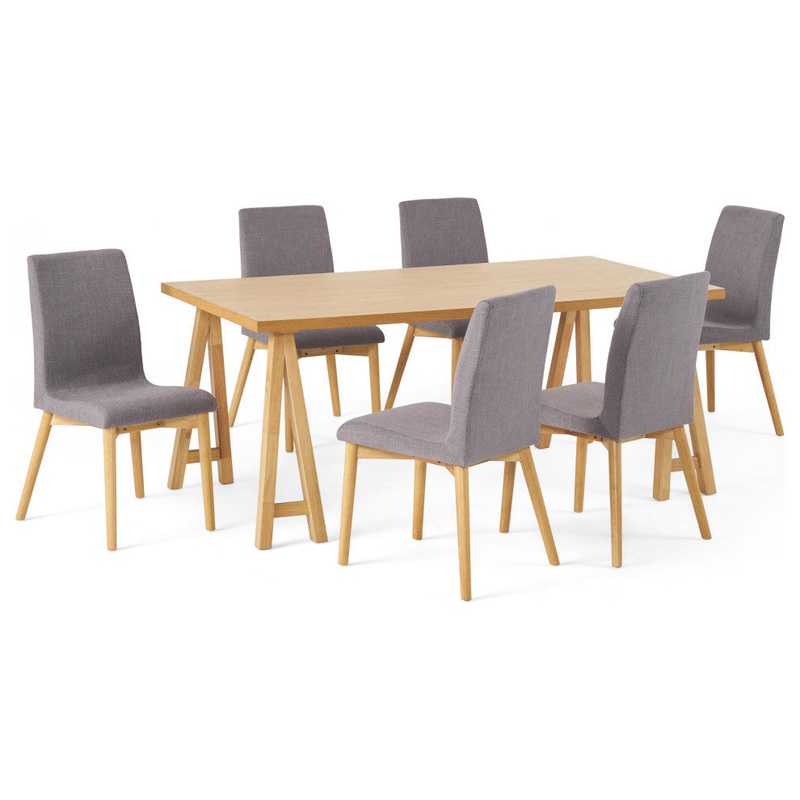 This contemporary dining set is a unique and functional way to add something fresh to your dining experience. Featuring plush upholstered chairs and a rustic-inspired wood table, this set is everything you have been looking for your dining area. Complete with seating for six people and plenty of table space, you will find conversations with your guests effortless and enjoyable and your meals warm and hearty.