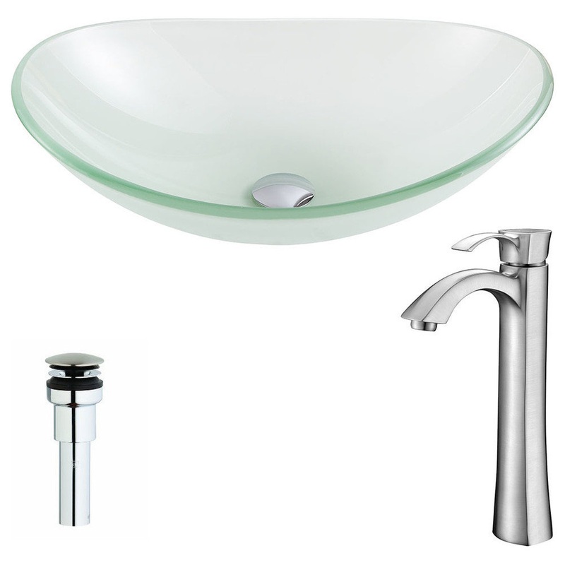 The ANZZI Forza Series sink is a traditionally crafted oval vessel sink adorned in a Lustrous Frosted Finish. Coupled with the ANZZI Harmony Vessel Sink Faucet, this combination provides pure elegance in any bathroom. Each ANZZI vessel sink and faucet is formed using RHINO ALLOY certified materials for strength and quality along with high tempered Deco-Glass. The result is a perfectly shaped dynamically captivating vessel and faucet centerpiece for any bathroom counter.