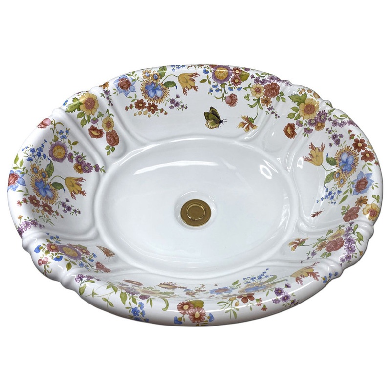 -"SCHUMANN FLOWERS" Shown on AP-1500 Cambridge drop-in bathroom sink. You can customized the colors to your specific dcor. -White/Multicolor. -Drop-in bathroom sink. -Oval shape. -Exterior dimensions 20" W x 16" D x 7-1/2" H. -Inside dimensions 17-1/2" W x