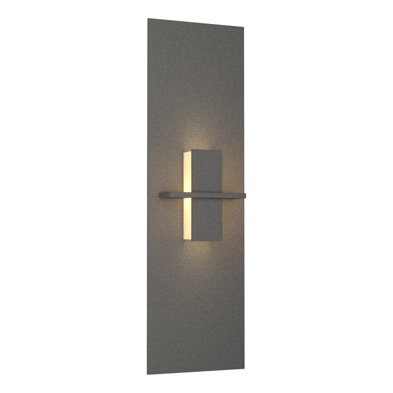 Our sconce features a handcrafted steel plate skillfully welded to a slim band of metal with all attached to a textured rectangular steel back plate. A single light glows from behind a glass diffuser. Forged by artisans here in Vermont, each piece is unique.