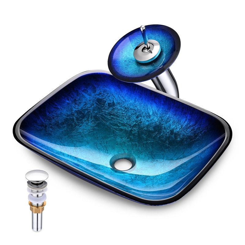Features: -Aquaterior Bathroom Sink & Faucet Kit includes a rectangle glass sink with shinny & gradient blue ripple pattern and a waterfall spout faucet which stimulates natural spring to release clean stream, ideal for enhancing aesthetic appeal and blend