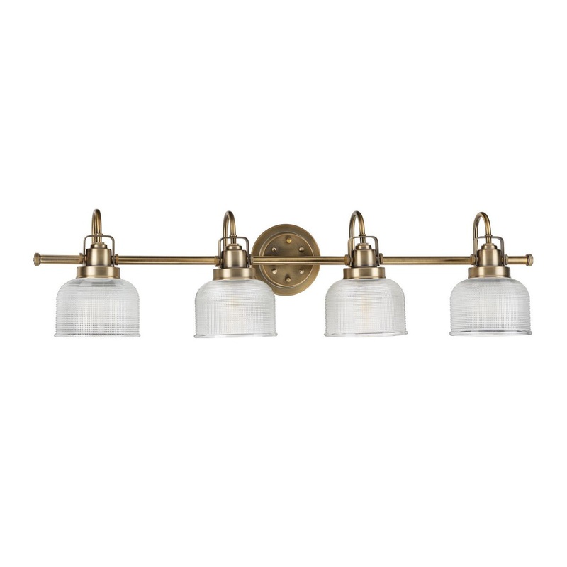 Opt for stronger focused light illumination with the impressive Archie four-light bath. Four refined, double-prismatic glass shades hang shoulder to shoulder, each supported by its own curved arm. A single, straight bar supports the light sources and fuses the entire structure to a circular backplate. With its Vintage Brass finish, the fixture is perfect for inspiring an old-world feel as it brightens a bathroom or dressing table mirror, a hallway, or wherever focused light is called upon in farmhouse and transitional interiors.