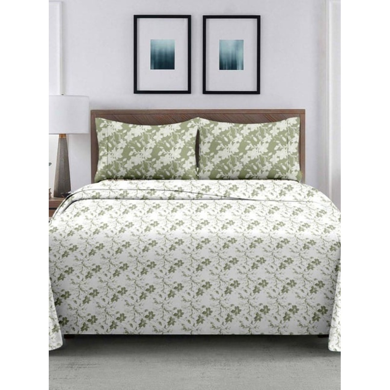 Ariana ROME White & Green Cotton 210 TC Double Size Bedsheet With 2 Pillow Covers
