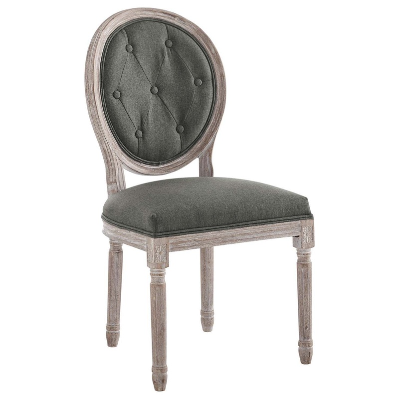 Revel in the whispered opulence of the Arise Dining Side Chair. Featuring a fluted wood frame, button tufted diamond trim, elegant welting, dense foam padding, an upholstered fabric seat, this oval back dining or accent chair elegantly blends old world charm with modern intrigue. Designed with a vintage French look and an undeniable appeal, Arise supports up to 331 pounds and comes with foot pads to preserve flooring. Comes fully assembled.