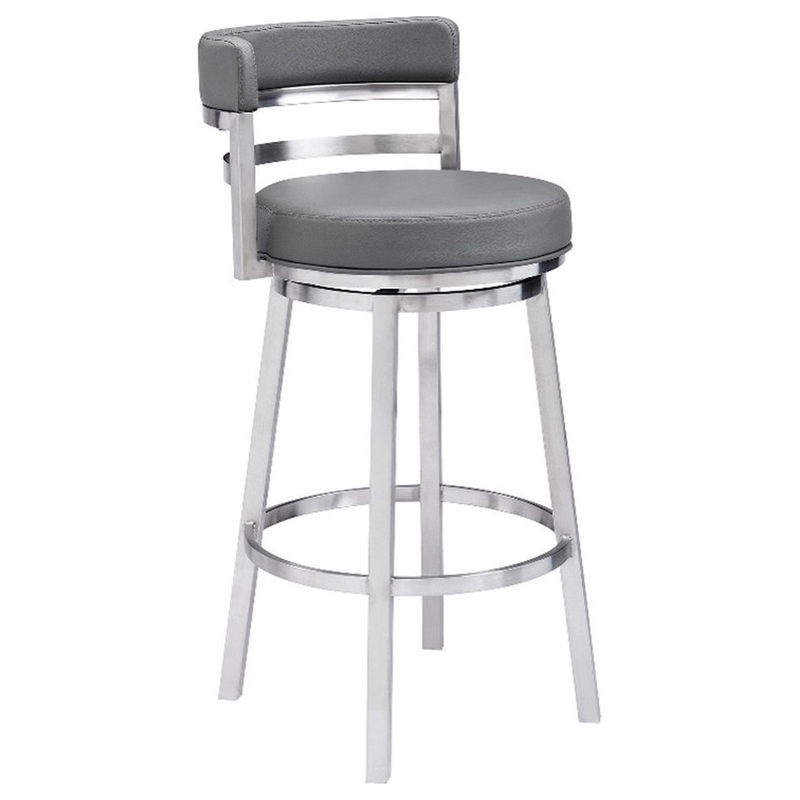 The Armen Living Madrid 30" Gray Faux Leather and Stainless Steel Armless Bar Stool features a unique aesthetic that is certain to work well in any modern household. The Madrids durable brushed stainless steel frame is accompanied beautifully by its black