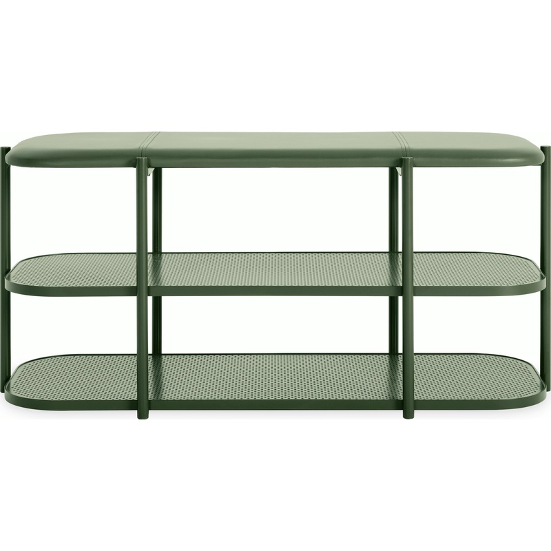 Create the ideal entry anywhere with the well-considered Arrive Storage Bench (2024), designed exclusively for DWR by Stockholm-based Afteroom. With its welcoming, rounded lines, comfortable leather-cushioned bench, and roomy shelves, this is an all-in-one solution to creating both seating and organized storage by your front or back door. The durable powder-coated steel mesh shelves are designed to hold baskets, bags and backpacks, hats and gloves, sports or pet supplies with style, and to let shoes and boots drip-dry and air out. Designed for the heavy-duty use of a busy family or household. Made in Poland.