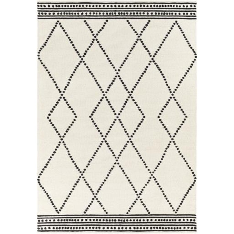 100% WoolHand TuftedBacking: CanvasLow PileThickness: 0.39"LoopedColors: Black, CreamTPX: 19-4004, 11-4300Made in India