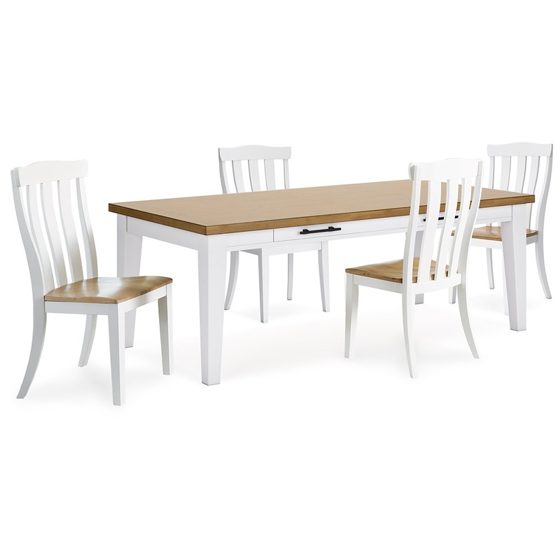 Casual style with substance. This dining packages two-tone finish of classic white and butcher block oak veneer adds a relaxed vibe to a delicious design. The tables convenient side drawers maximize space, while the curved shape of the bent slat-back chair frame offers a sense of modern farmhouse style. This charmingly curated set is spacious enough to accommodate work or play in your informal dining room or eat-in kitchen.
