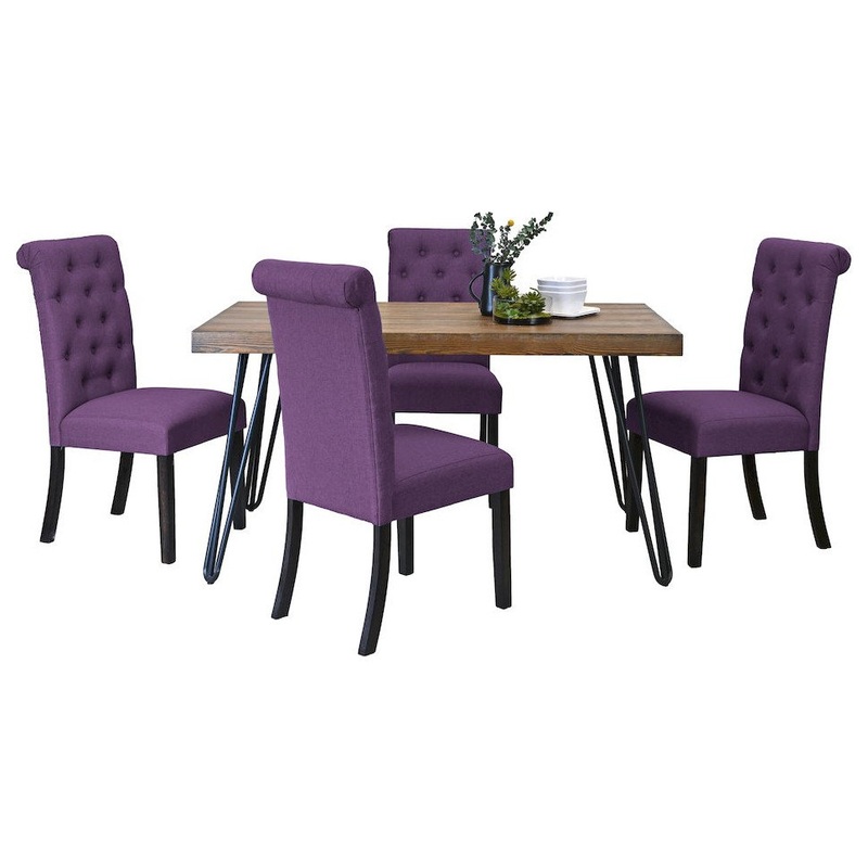 Discover a sophisticated dining atmosphere with the Ashford 5-Piece Set from Roundhill Furniture. This meticulously crafted dining set combines functionality and elegance, making it the perfect addition to any dcor. The set includes a spacious dining table and four comfortable chairs, providing ample seating for family and guests. The dining table features a rustic dark pine finish with a metallic hairpin design, showcasing a beautiful wood grain texture that is sure to impress your guests. The tabletop is constructed with durable engineered wood and is well-coated, ensuring long-lasting durability. The chairs feature a button-tufted design and are well-padded for added comfort. Finished in dark espresso, they create a striking contrast with the polyester fabric upholstery. Supported by a sturdy wood frame with rich-dark espresso legs, these chairs offer lasting stability. Immerse yourself in contemporary design and lasting craftsmanship with the Ashford Dining Set. Choose from four color options: Blue, Gray, Tan, and Purple.