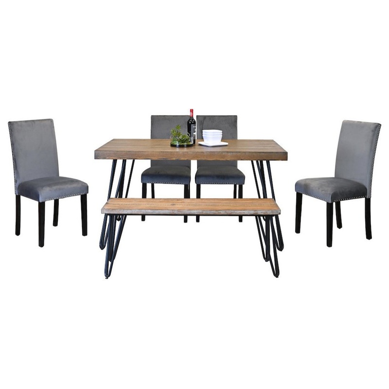 Enhance your dining experience with the Ashzo 6-Piece Dining Set from Roundhill Furniture. Crafted with meticulous attention to detail, this set effortlessly combines style and functionality for an exceptional dining arrangement. The set includes a spacious dining table, four comfortable chairs, and a matching bench, providing ample seating for family and guests. Both the dining table and bench feature a rustic dark pine finish with a metallic hairpin design, showcasing a beautiful wood grain texture that is sure to impress your guests. Both table and bench top are constructed with durable engineered wood and is well-coated, ensuring long-lasting durability. The chairs, adorned with chrome nailhead trim on soft velvet upholstery, strike a perfect balance between elegance and comfort. Supported by a sturdy hardwood frame with rich dark espresso legs, these chairs offer lasting stability. Immerse yourself in contemporary design and lasting craftsmanship with the Ashzo Dining Set. Choose from 3 color options: Black, Blue, and Gray.