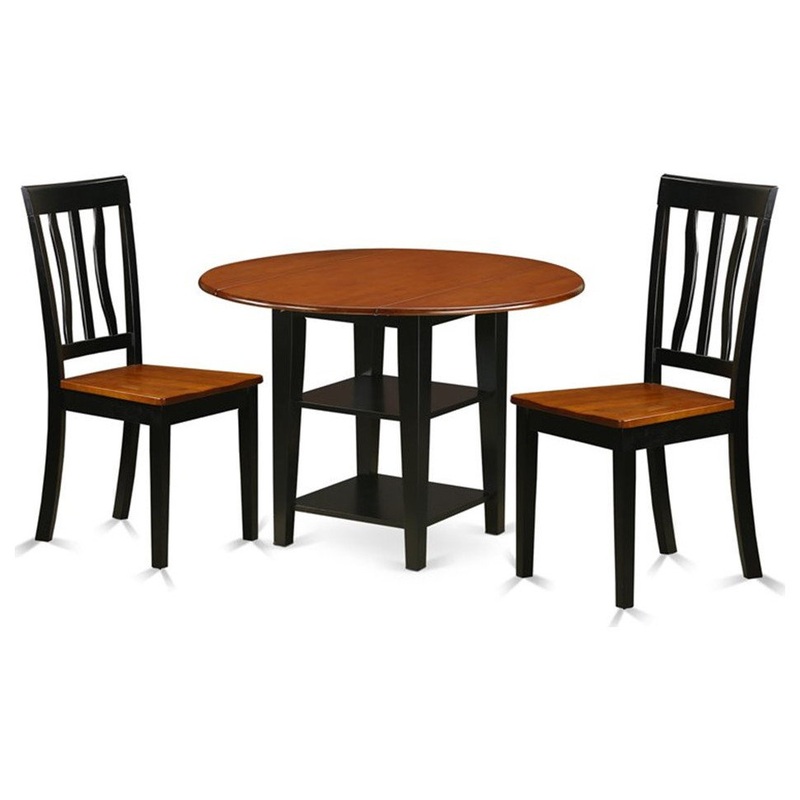 Bring comfort into your breakfast nook or bring traditional charm back into the dining room with this must-have three-piece dining set. Founded atop 4 solid table legs, its table features a round silhouette with two state-of-the-art drop leaves. Surrounding this center table are 2 matching side chairs, each featuring turned legs and a curved slatted back. All finished in complementing Black & Cherry tones for a versatile look that works in a variety of aesthetics.