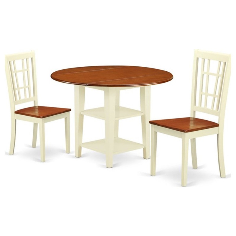 Create that everlasting atmosphere for the dining room with this essential 3 Piece Dining Set, perfect for weekday meals and family gatherings alike. Bask in the superb quality of this kitchen set thanks to the quality of wood used and overall aesthetic it provides to pretty much any room it is placed in. The table sits on 4 solid legs and features 2 shelves below the table top, allowing you to place small to medium objects securely under the table. We guarantee the quality and safety when you use this product, so you can be sure that every use is up to par. This particular set is finished in a warm Buttermilk & Cherry with wood seats.
