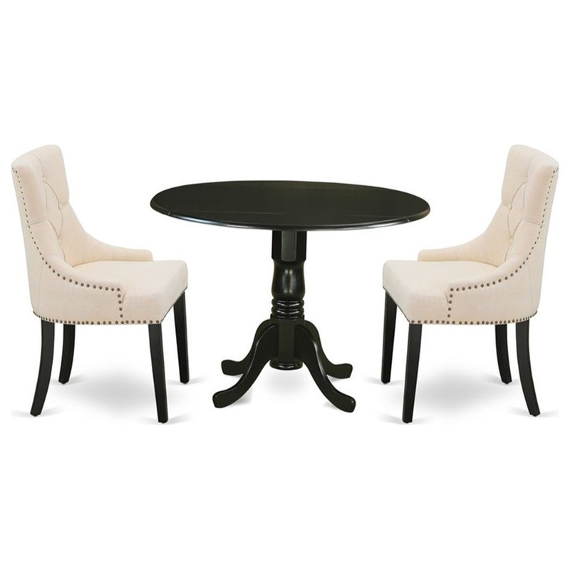 Enrich the elegance of your dining area with this Atlin Designs dining set includes a round dinette table and two parson chairs. The fantastic round dining table features black color that complements a number of different attractive themes. The drop down leaf can be easily expanded the kitchen table making more personal space for certain occasions or great parties. A single bevel edge and a rounded finish provide this dining room tables fits into a small kitchen space, great for compact apartments. The dinette table is created from prime quality rubber wood known as Asian Hardwood. No heat treated pressured wood like MDF, particle board or veneer top fabricated. A regal and affordable Parson chair offers a touch of beauty to any dining room and provides a sensible seating arrangements. The upholstered parson chair features a beautiful stitched exterior. Standard back, Linen Fabric, Button tufted high-density foam padding, solid hardwood frame construction, comfortable, durable and attractive. Whether you use this dining chair is an easy to assemble and stylish answer to your seating needs. The standard shape, size and design makes the dining area significantly attractive. This contemporary, budget friendly, durable and comfortable dining set can be good choice if you are looking for a great dining time experience with your family or friends.