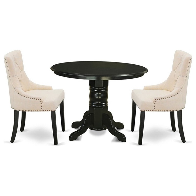 Turn your house into a home with this exclusive and sophisticated Atlin Designs kitchen dining set. The classic round dinette table offers a stunning black color to enhance any kind of living area or home’s kitchen area for any occasions. A thick curled ornate pedestal base provides strength and state-of-the-art impression to the round dining room table. Made up of rubber wood, the table is stable and offers a sturdy finish. This small dining table requires a very little space and itd be a great choice if you are struggling with space in your dining area. The kitchen table makes a really great addition for all kitchen space and corresponds all sorts of dining-room concepts. A regal and affordable Parson chair offers a touch of beauty to any dining room and provides a sensible seating arrangements. The upholstered parson chair features a beautiful stitched exterior. Tall back, Linen Fabric, high-density foam padding, solid hardwood frame construction, comfortable, durable and attractive. Whether you use this dining chair is an easy to assemble and stylish answer to your seating needs. The standard shape, size and design makes the dining area significantly attractive. This contemporary, budget friendly, durable and comfortable dining set can be good choice if you are looking for a great dining time experience with your family or friends.