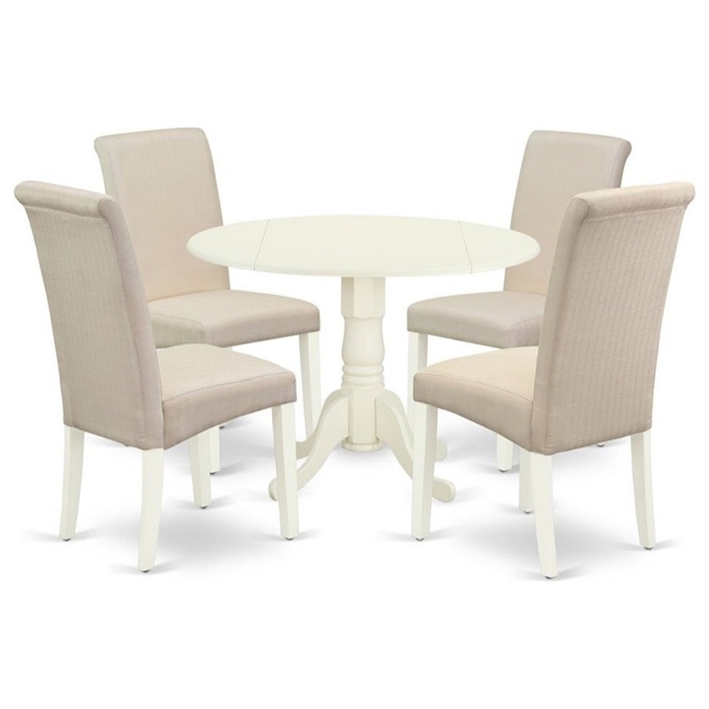 Enrich the elegance of your dining area with this dinette set includes a round dinette table and four parson chairs. This fantastic round dining table features a luxurious linen white color that complements a number of different attractive themes. The drop