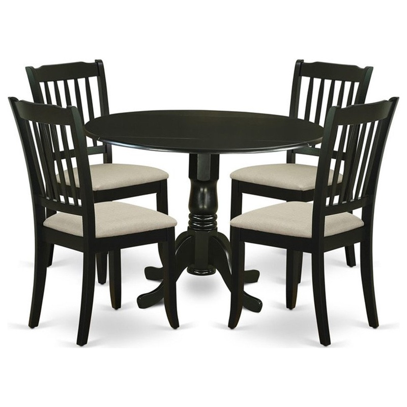 Enrich the elegance of your dining area with this Atlin Designs dinette set includes a round dinette table and four kitchen chairs. The fantastic round dining table features black color that complements a number of different attractive themes. The drop down leaf can be easily expanded the kitchen table making more personal space for certain occasions or great parties. A single bevel edge and a rounded finish provide this dining room tables fits into a small kitchen space, great for compact apartments. The dinette table is created from prime quality rubber wood known as Asian Hardwood. No heat treated pressured wood like MDF, particle board or veneer top fabricated. This eye-catching Atlin Designs dining room chair offers a modern and sophisticated look. The kitchen chairs come with a Linen upholstery seat to fit personal preference and perfect design. This Stylish dining chair features curved front legs. Elegant dinette chairs feature 7 vertical slats to give any dining area a touch of class and sophistication. Finished in elegant Black Color. This budget friendly, durable and comfortable dinette set can be good choice if you are looking for a great dining time experience with your family or friends.