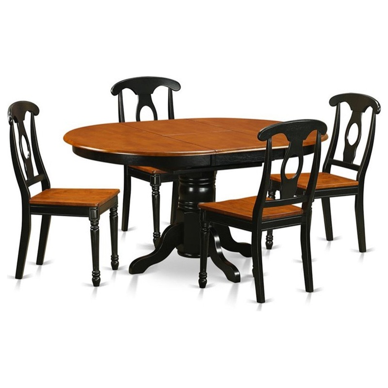 -5 piece oval dining table with single pedestal featured 18in self storage leaf and 4 dining chairs with wood seats