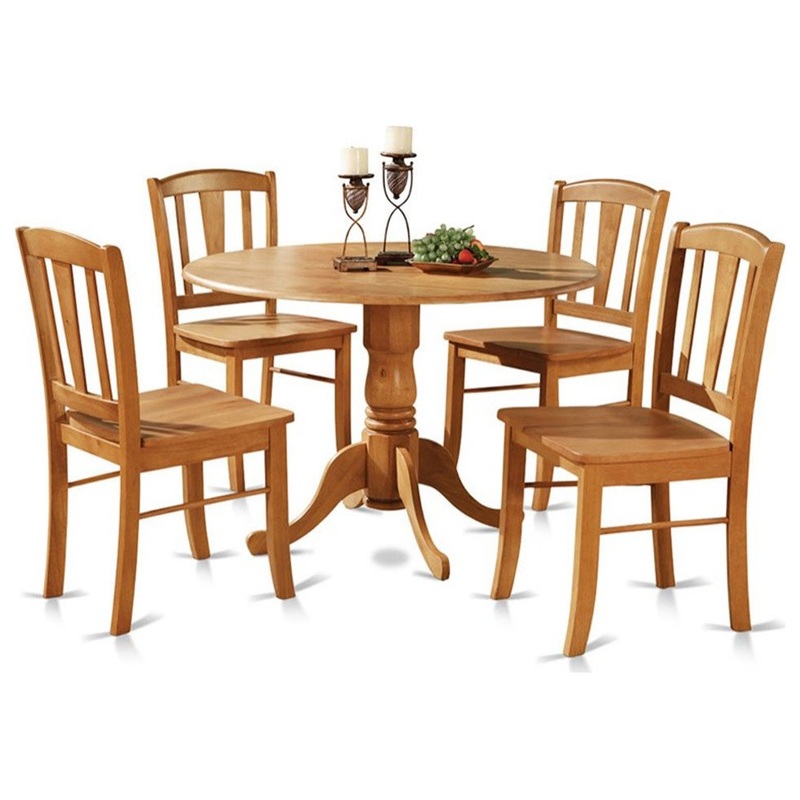 The drop leaf kitchen dining tables set are of compact size, that's great for smaller dining area. Constructed out of Asian hardwood, the round dining table set is finished with a clean Oak Color. The kitchen dining tables set fit wonderfully in every trad