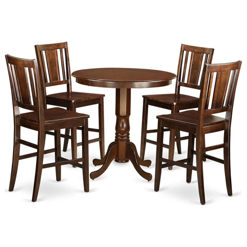 This table and chairs set with round pedestal table comprises of four chairs. All pieces are made out of Asian Hardwood (Rubberwood) in a dark Mahogany finish. The set is counter height which is ideal for entertaining or casual mealtimes and it is a perfect piece for a breakfast nook or a small dining space such as in an apartment.
