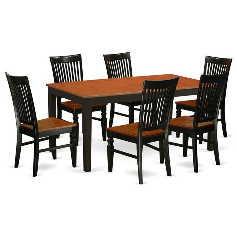 Rectangular kitchen table offers a feeling of luxury and traditional styling with a fashionable flair. Dining table set are crafted of real Asian hardwood for strength and outstanding steadiness. Dining room table and kitchen chairs are offered in a finished Black & Cherry, and a sharp Buttermilk & Cherry color alternative. Stable dining chairs are made with an uncomplicated geometric back that will brings an element of elegance to any dining area. Table functions, an easy to use butterfly leaf with additional space for exceptional benefits. Dinette chair are provided with solid wooden seat to provide to any preference. This specific 7 PC kitchen table set with one table and six dining chairs.