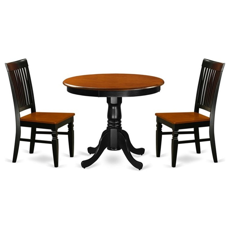 Sleek antique table and chair set contributes elegance to any kind of dining area or morning meal nook. This beautiful kitchen table and kitchen chairs set is finish in a rich linen white color. This 36 inch circular table top with beveled edges is pristine enough to show fine china and strong enough for your family barbecue. Sustained by a stylish 30 inch pedestal stand which offers four stylishly etched legs. Lovely, slatted, high backed dining chairs offer elegant contours throughout and stylish detailing. 3 pc set with one table and two solid wood seat dinette chairs in a distinctive black and cherry.