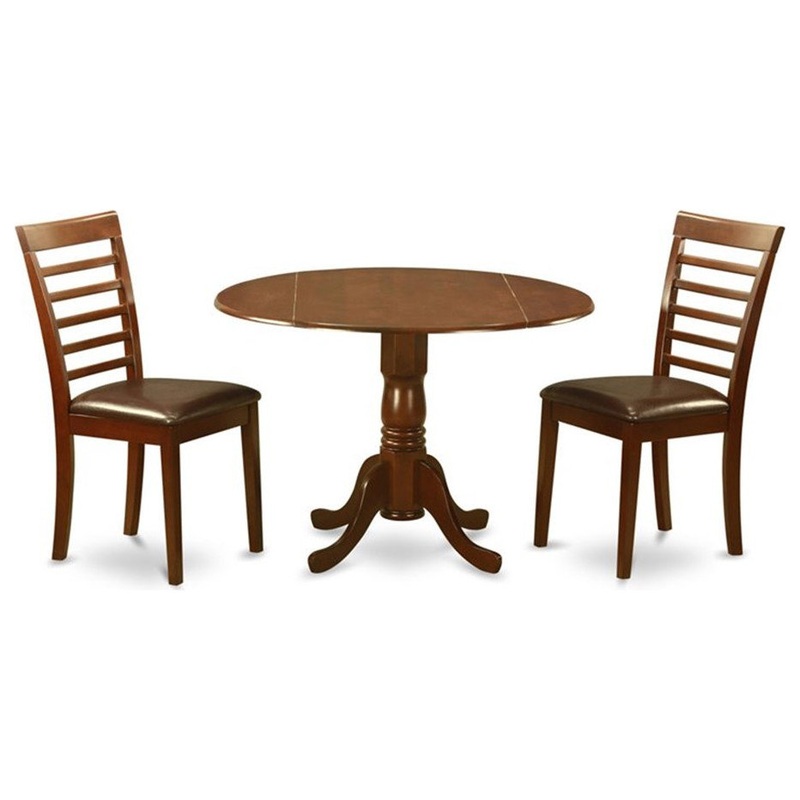This particular mahogany circular kitchen dining table can add that fantastic effect for dining beauty to both standard and contemporary decorations. The drop leaf dinette table is sustained with a well-built wood carved pedestal, branching off into four rounded legs. This adaptive kitchen dinette table includes a cross measurement of 42 and a height of 30 and 9 drop leaves to add more personal setting. The stable dining chair present an exquisite yet pleasant ladder back style with 4 horizontal slats for your attractive finish. The kitchen chairs have faux leather upholstered seat for your ease and comfort.