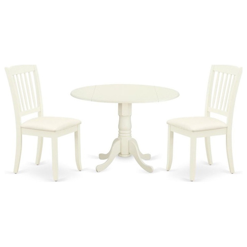 Enrich the elegance of your dining area with this Atlin Designs dining set includes a round dinette table and two dining chairs. The fantastic round dining table features linen white color that complements a number of different attractive themes. The drop down leaf can be easily expanded the kitchen table making more personal space for certain occasions or great parties. A single bevel edge and a rounded finish provide this dining room tables fits into a small kitchen space, great for compact apartments. The dinette table is created from prime quality rubber wood known as Asian hardwood. No heat treated pressured wood like mdf, particle board or veneer top fabricated. This eye-catching Atlin Designs dining room chair offers a modern and sophisticated look. The kitchen dining chairs come with a linen upholstery seat to fit personal preference and perfect design. This stylish dining chair features curved front legs. Elegant kitchen chairs feature 7 vertical slats to give any dining area a touch of class and sophistication. Finished in luxurious linen white color. The standard shape, size and design makes the dining area significantly attractive. This budget friendly, durable and comfortable dining set can be good choice if you are looking for a great dining time experience with your family or friends.