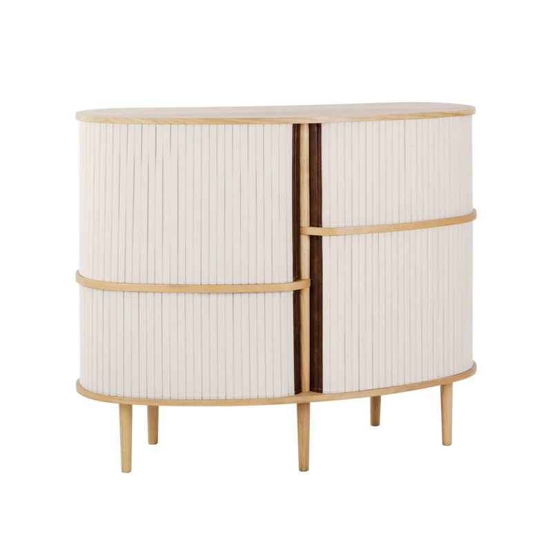 Az Audacious kabinet a hagyomnyos trolsi megoldsokat egy csipetnyi visszafogott luxussal gondolja jra. A kabinet velt, organikus sziluettje az szaki kecsessget idzi, mg a szvetbl kszlt tamburs tolajtk egy csipetnyi modern nosztalgit adnak hozz, zkkenmentes tmenetet teremtve a mlt s a jelen kztt. Szaktva a tmr, szgletes kockk hagyomnyos felfogsval, az Audacious kabinet organikus vei letet visznek brmilyen lettrbe, meleg s bartsgos krnyezetet teremtve. A kabinet llthat polcokkal s tgondoltan kialaktott kivezetsekkel rendelkezik a polcokon s a htlapon, lehetv tve, hogy a szekrny belsejben zkkenmentesen elrejtsd a kiegsztket s konzolokat. A tamburs ajtk knnyen cserlhetk, ami azt jelenti, hogy kicserlheted ket, s j letet adhatsz a dizjnnak anlkl, hogy egy teljesen j btordarabot vsrolnl, gy megkmlve a vilg erforrsait s meghosszabbtva a dizjn lettartamt.