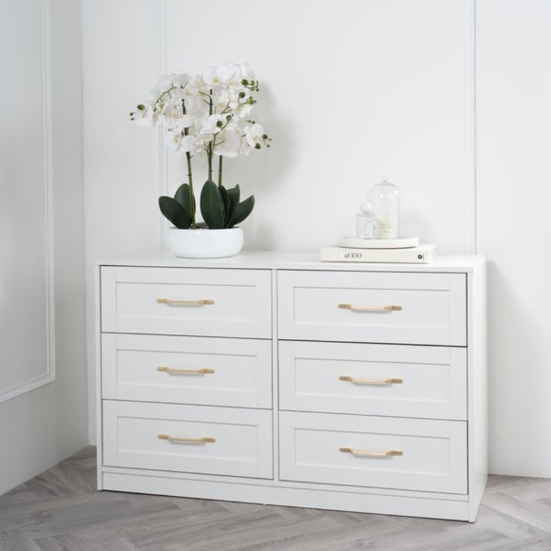 White finishShaker styleClean, modern lookSix drawersBrushed brass handlesMatching items availableRaise your organisation game in style with this six-drawer chest. Featuring brushed brass handles and a shaker design, this chest will blend effortlessly with
