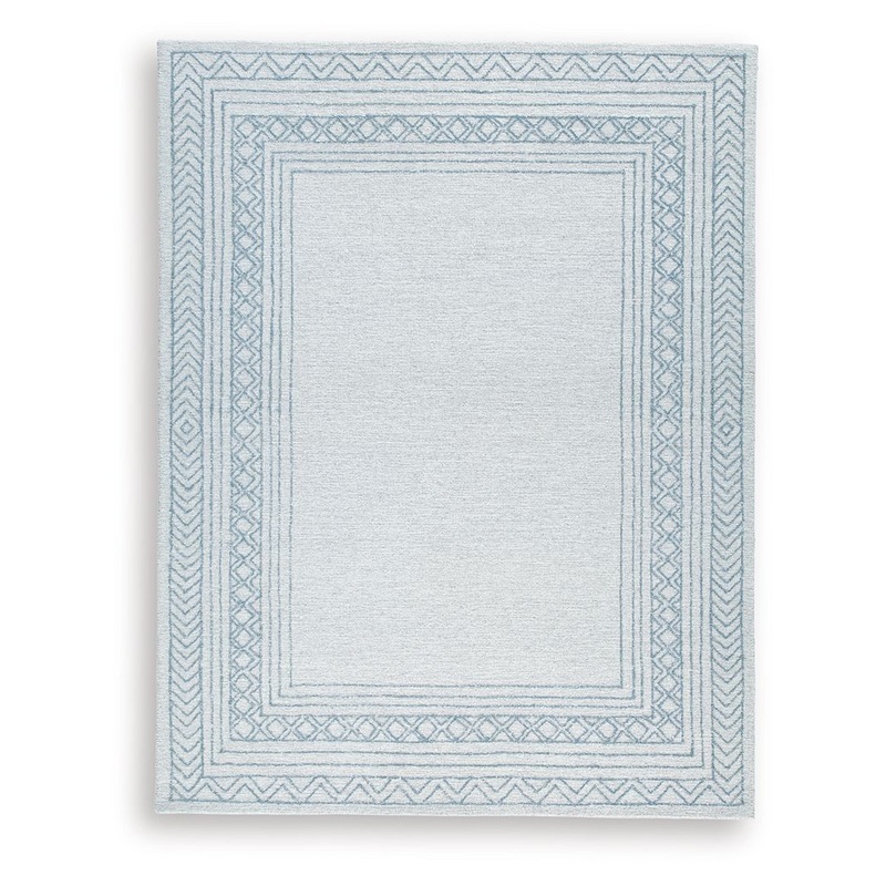 Soft, serene style. This area rug combines the comfort of hand tufted wool with the soothing feel of coastal casual aesthetics. Its detailed border design, in a palette welcomes with relaxed character.Azelhurst - Blue / Ivory / Gray - Large Rug92.0"W x 120