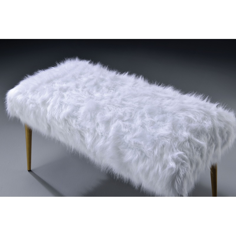 ACME Bagley II Bench, White Faux Fur & Gold, 38" x 18" x 20"H, 24lbs. Exude an air of sophistication and comfort with this Bagley II bench. Featuring white faux fur seat cushion and gold metal base, this armless lounge bench is destined to be your favorite