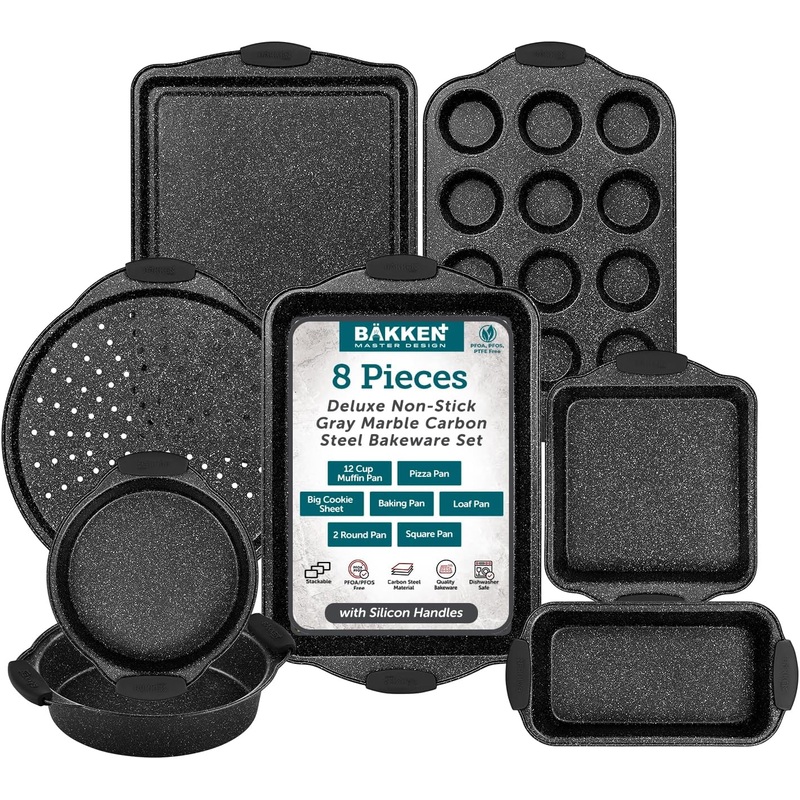 BAKKEN 8-Piece Kitchen Oven Baking Pans Set Deluxe Nonstick Gray Marble Coating, Professional Grade Carbon Steel Bakeware with Silicone Handles Oven, Dishwasher, and Freezer Safe Introducing the BAKKEN 8-Piece Kitchen Oven Baking Pans Set, your ultimate so