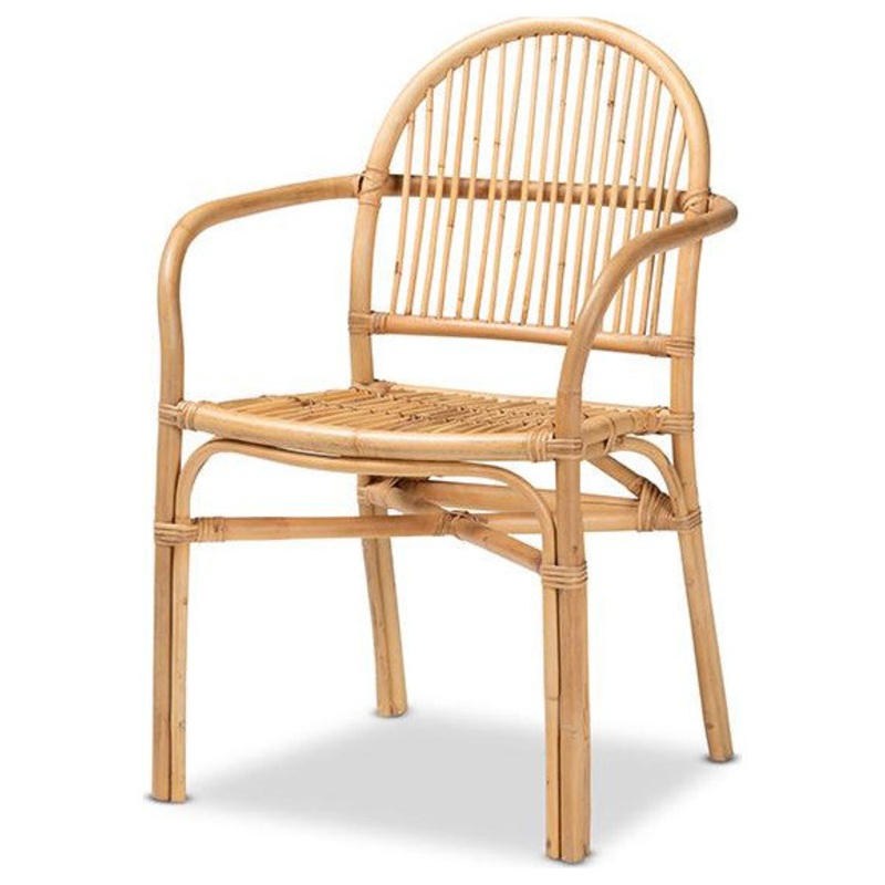 Renew the adoration for your dining space with the remarkable allure of the Tugera dining chair. Made in Indonesia, this chair is handcrafted by skilled artisans with natural rattan. The round backrest is interlaid with slim rattan rods for a smooth embrace, while the pronounced armrest offers convenient comfort. The Tugera will arrive fully assembled and features angled legs connected by a crisscross base for excellent stability and support. Encapsulating the allure of an exotic retreat, the Tugera dining chair elevates the mood of any occasion.Due to the nature of the natural materials used in this product, it may have variations in areas such as, but not limited to, color, pattern, grain and texture. The hair-like strands of rattan/rattan-fiber are common due to nature of the material.