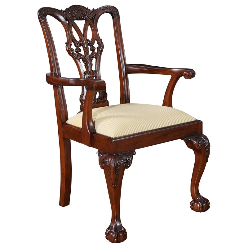 This Ball & Claw Chair by Niagara Furniture, is fully decorated with carving, the style of the chairs being reeded. The carved crest rails above carved pierced splats with drop in the seat frame, which are supported by cabriole legs with carved knees and carved ball and claw feet. All produced from kiln dried, plantation grown solid mahogany. Upholstered in neutral fabric, ready to be used and enjoyed. Arm Height approximately 27 inches and seat height approximately 21 inches.