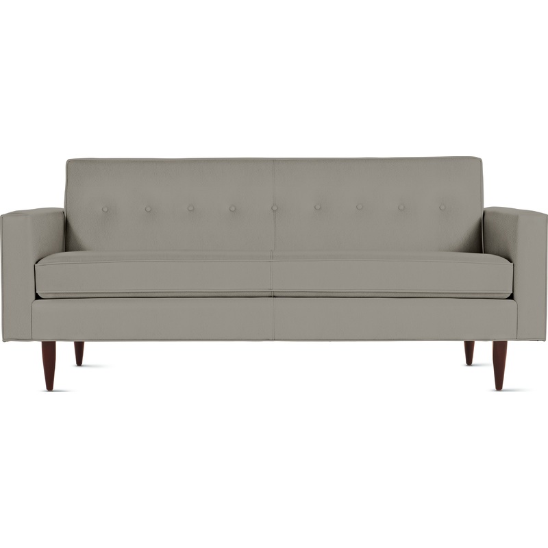 The Bantam Sofa (2004) celebrates the soft, less-machined brand of modernism that arose in the United States in the 1930s. The frame is lightly padded and finely upholstered, with a single row of button tufting on the back. Matching piping along the seams reinforces Bantams clean lines. Tapered solid wood legs lend visual lightness. Comes with legs finished in a rich walnut stain. For legs in a honey or coffee finish, contact a DWR Studio or call us at 1.800.944.2233.