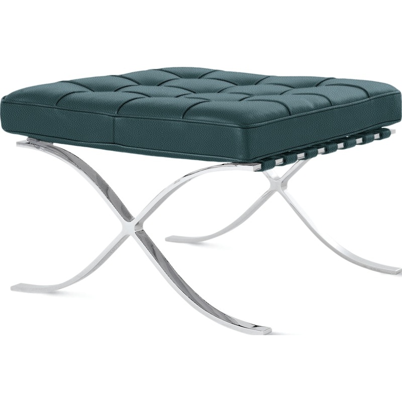 Originally created for the attendants to the king and queen of Spain, the Barcelona Stool (1929) by Ludwig Mies van der Rohe continues to endure as an icon of modernism and master craft. Its upholstered using a single Spinneybeck cowhide and supported by a polished chrome frame hand-buffed to perfection. To create the deep, precise tufting, individual panels of leather are cut, hand-welted and hand-tufted. The Barcelona Stool is a registered trademark of Knoll, Inc., this is the authentic Barcelona Stool by Knoll.