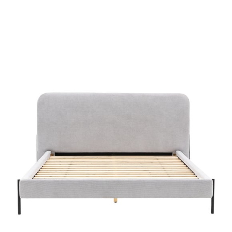 This bed frame features a minimalist design, characterised by clean lines and a rounded headboard. The sleek black metal legs effortlessly complement the soft curves of the headboard, creating an effortlessly cool aesthetic. Available in different sizes and colours, this bed frame offers flexibility to suit various interior styles.