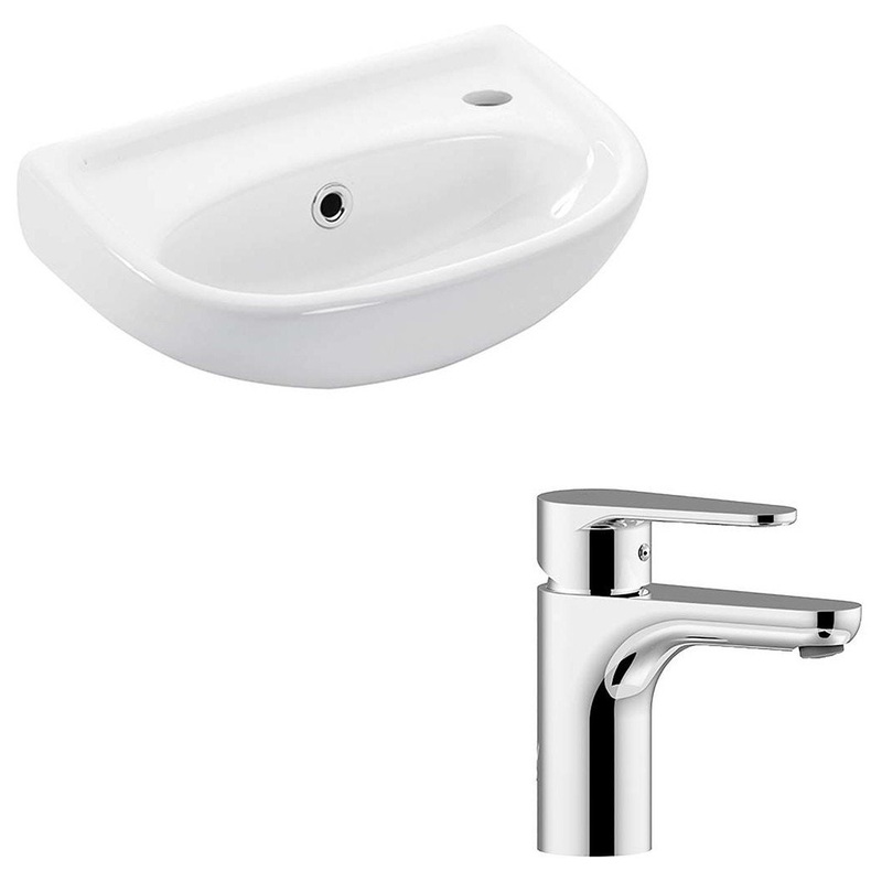 Basic 4000.01L+GR 071 CR by WS Bath Collections, 15.5" L x 9.8" W x 6.1" H Ceramic White Bathroom Sink and Polished Chrome Faucet, Basin to the Left of Faucet, Wall Mount Sink Installation, Single Hole Deck Mount Faucet, With Overflow Features: -Ceramic Wh