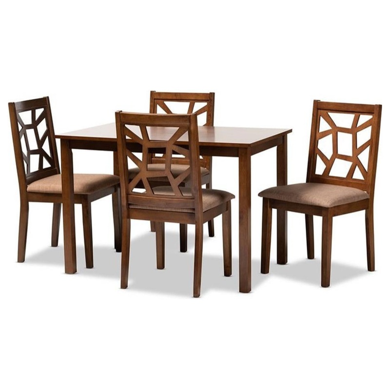 Revamp your dining room with the style and comfort of the Abilene dining set. Constructed from solid rubberwood in a warm walnut brown finish, this dining set includes one table and four chairs, each upholstered in a light brown polyester fabric that compl
