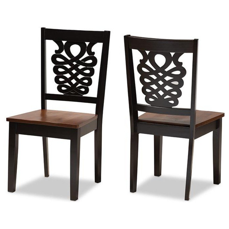 Imbue your dining space with the elegance of the finely crafted Gervais dining chair. Made in Malaysia, the Gervais is comprised of a sturdy wood frame showcasing a rich dark brown finish. The seat is finished in a distinctive walnut brown hue and is scooped for a more casual and comfortable dining experience. Requiring assembly, the backrest showcases a striking geometric design for added visual appeal. Straight legs add a touch of sleek, contemporary style, making the Gervais dining chair an excellent addition to the modern home.