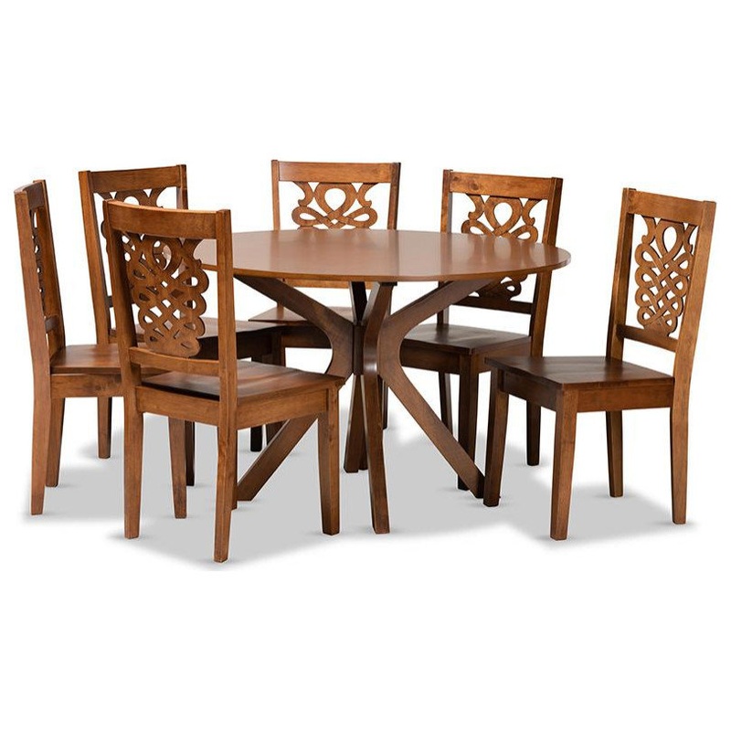Imbue your dining space with the elegance of the finely crafted Liese dining set. Made in Malaysia, this wooden set includes six chairs and one table showcasing a warm walnut brown finish. Each chair features a stunning geometric cut out design on its back