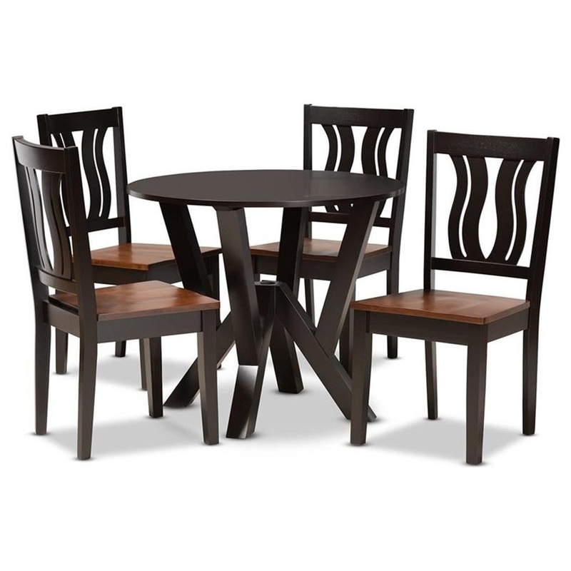 Featuring a unique, visually striking design, the Noelia dining set adds elegance to any dining space. Made in Malaysia, this wooden set includes four chairs and one table showcasing a distinctive two-tone dark brown and walnut brown finish. Each chair features a refined geometric cut out design on its backrest for added visual appeal, while a scoop seat lends casual comfort. Requiring assembly, the circular tabletop provides ample elbow room for each member of the table. Emanating graceful charm, the Noelia dining set is an exceptional addition to the modern home.
