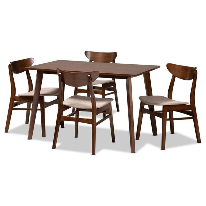 Efficient and streamlined design make the Orion dining set a refined addition to any dining space. Made in Malaysia, the Orion is constructed from durable wood and comfortably seats up to four. The walnut brown finished wood and rectangular tabletop lend modern style while giving each member of the table plentiful elbow room. Assembly is required and each chair is padded with foam underneath a layer of soft fabric for comfort. With its compact size, the Orion dining set is well suited for smaller nooks and dining spaces. Table Dimensions: 29.50″ High x 47.20″ Wide x 29.50″ Deep; Chair Dimensions: 30.70″ High x 18.30″ Wide x 20.50″ Deep; Seating Dimensions: 17.70″ High (from floor) x 17.50″ Wide x 15.20″ Deep; Back: 14.60″ High