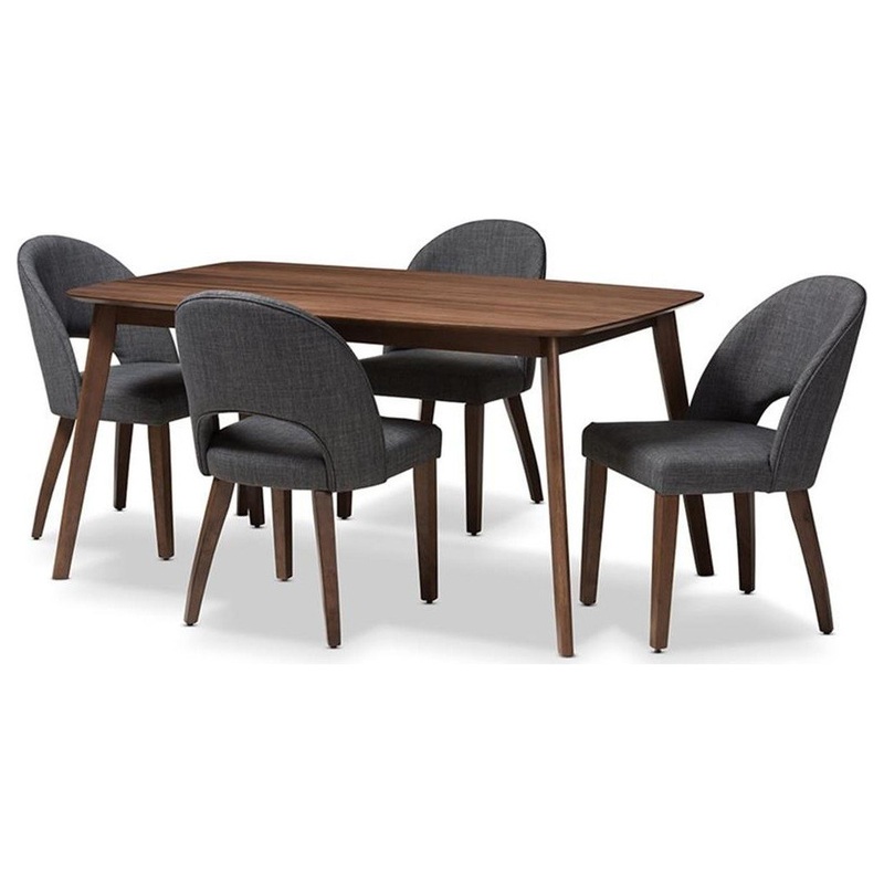 The Wesley 5-piece dining set is both fun and functional. The mid-century modern-inspired design of the set evokes a retro charm. The Wesley chairs are upholstered in dark gray fabric with foam-padded seats. The table of the Wesley dining set has a rounded edge design, encouraging a casual, mid-century modern-inspired vibe. The table and chair legs feature a warm, walnut-finish, with shapely angled legs. The chairbacks are delightfully bowed and open for comfort, with a smooth, arched look. Add a fun and retro flair to your dining room, breakfast nook, or rec room with the Wesley.