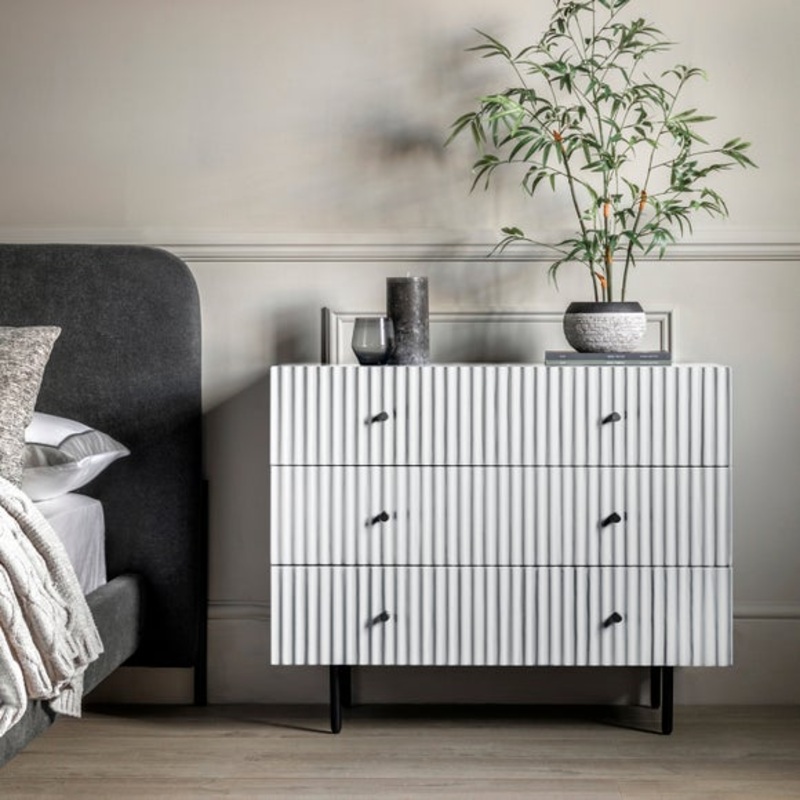 Boasting stylish drawer fronts with a vertical scalloped design, this chest of drawers adds a touch of sophistication to any space. The white painted finish exudes timeless elegance, while black metal legs and handles complete the contemporary look. Perfect for any modern apartment interior, this chest of drawers offers both style and practicality.