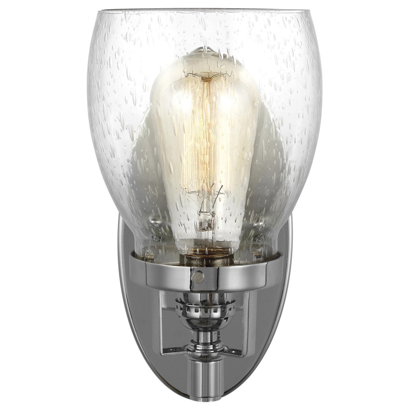 The Generation Lighting Lighting Belton one light wall sconce in chrome offers shadow-free lighting in your powder room, spa, or master bath room. Influenced by the vintage industrial designs of early 20th Century America, the transitional Belton lighting collection by Generation Lighting Lighting has Seeded glass shades that highlight the classic Edison bulbs. The rich Heirloom Bronze and Brushed Nickel finishes adds to the layer of retro design to the warm look. The assortment includes three- and five- down light chandeliers; five-light upright chandelier; a four-light island pendant; one-light pendant; one-light mini pendant; and one-, two-, three- and four-light bath fixtures. All fixtures are California Title 24 compliant and easily convert to LED by purchasing LED lamps sold separately.