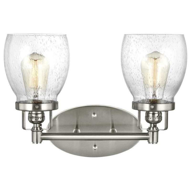 The Generation Lighting Lighting Belton two light vanity fixture in brushed nickel is an ENERGY STAR qualified lighting fixture that uses fluorescent bulbs to save you both time and money. Influenced by the vintage industrial designs of early 20th Century America, the transitional Belton lighting collection by Generation Lighting Lighting has Seeded glass shades that highlight the classic Edison bulbs. The rich Heirloom Bronze and Brushed Nickel finishes adds to the layer of retro design to the warm look. The assortment includes three- and five- down light chandeliers; five-light upright chandelier; a four-light island pendant; one-light pendant; one-light mini pendant; and one-, two-, three- and four-light bath fixtures. All fixtures are California Title 24 compliant and easily convert to LED by purchasing LED lamps sold separately.
