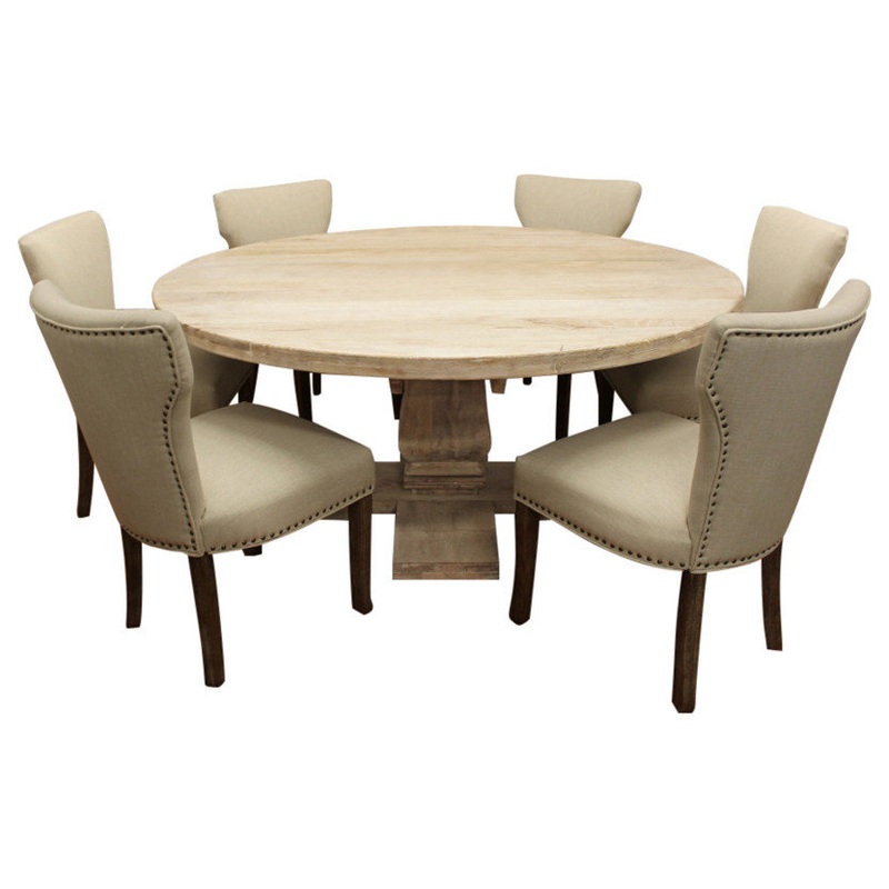 This 6-person dining set ties together traditional craftsmanship with an elegant modern twist. It includes one 70" round solid wood dining table, and 6 ivory linen upholstered side chairs. This table is finished in a hand-distressed white wash to bring out