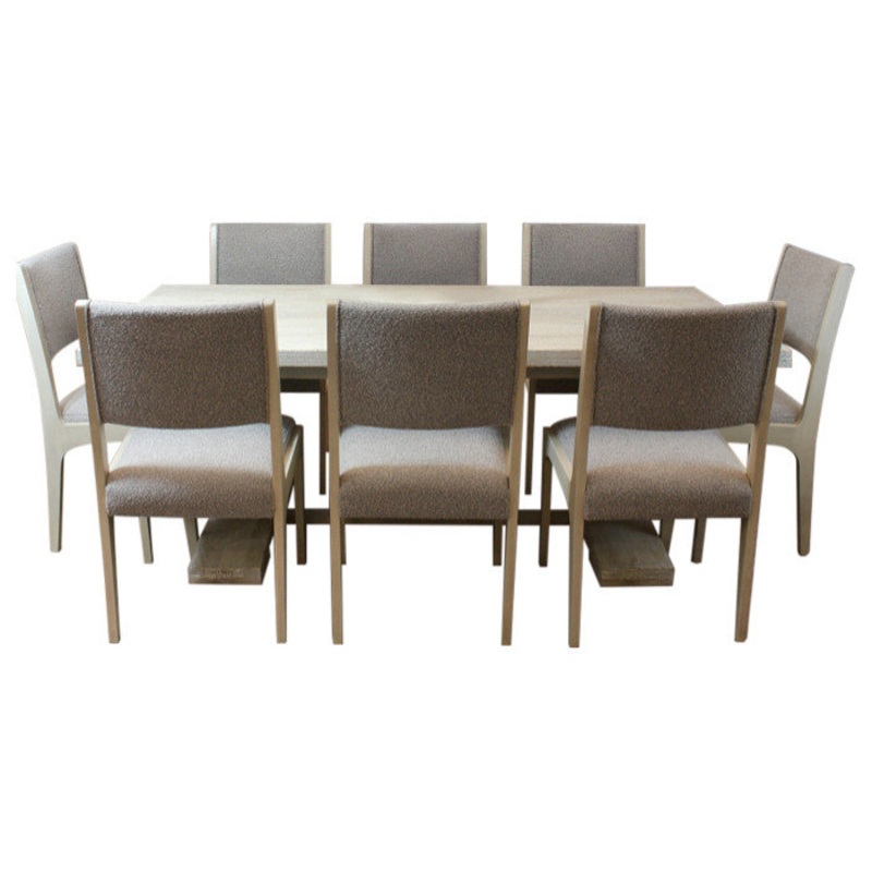 This 8-person dining set ties together traditional craftsmanship with an elegant modern twist. It includes one 81 rectangular solid wood dining table, and 8 solid ash wood side chairs. This table is finished in a hand-distressed white wash to bring out the natural wood grain variation. Each chair is upholstered in premium boucle fabric for a touch of class.